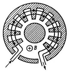 В пространстве взаимодействия электрическое и магнитное поля взаимно перпендикулярны. Электроны, находясь в пространстве взаимодействия, движутся по траекториям, напоминающим циклоиду, и образуют электронный поток, вращающийся вокруг катода.